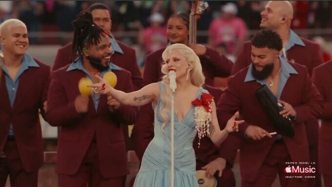 - El viraje en el concierto de Benito inició cuando, tras la escenificación de una boda, apareció sorpresivamente Lady Gaga cantando “Die With a Smile” (una balada que hizo junto a Bruno Mars), pero en versión salsa, junto al conjunto puertorriqueño Los Sobrinos. La cantó y luego bailó junto a Benito su canción “Baile inolvidable”. Un guiño a la unión y convivencia de culturas que hacen tan variado a Estados Unidos.