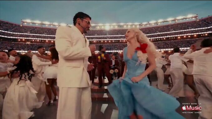 - El idioma español fue mayoritario en el evento. El espectáculo empezó con el mensaje “Benito Antonio Martínez Ocasio presenta… el espectáculo del medio tiempo del Súper Tazón”.