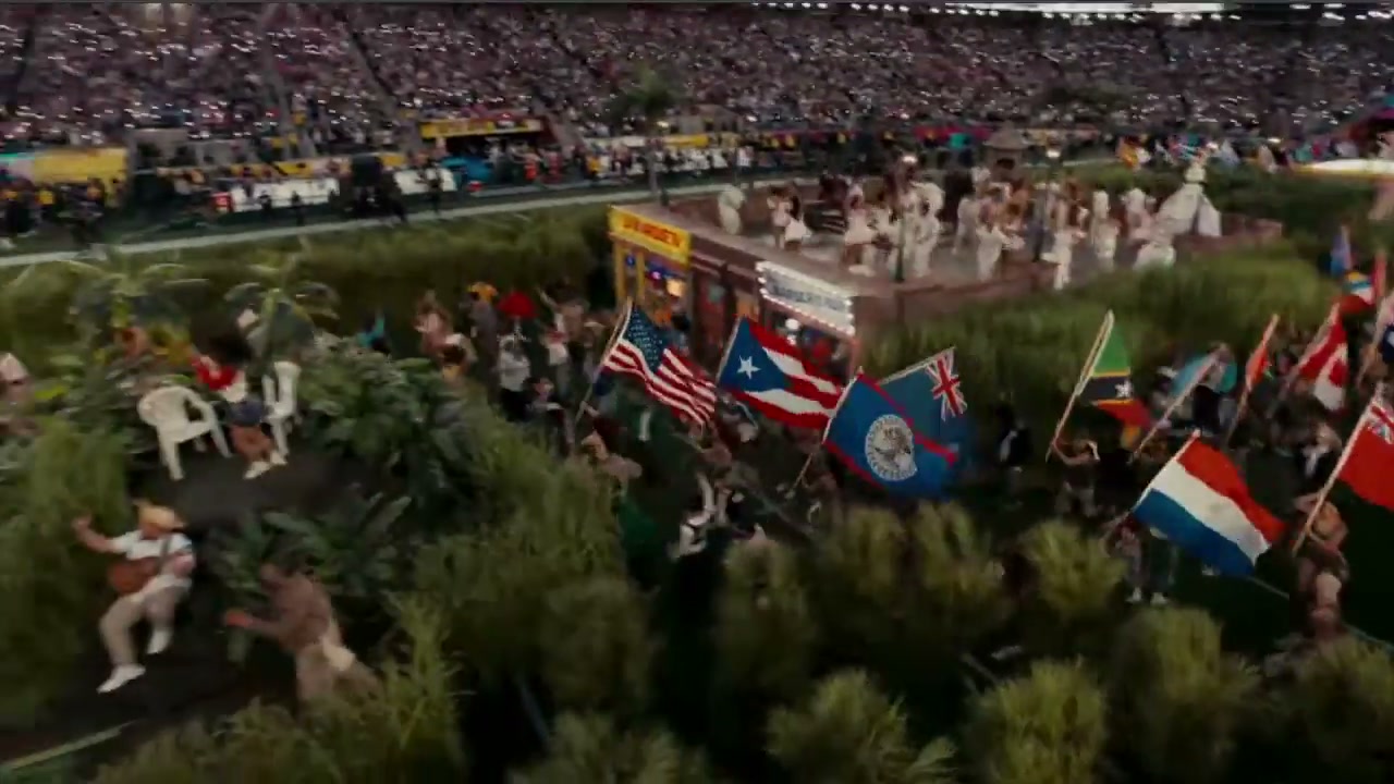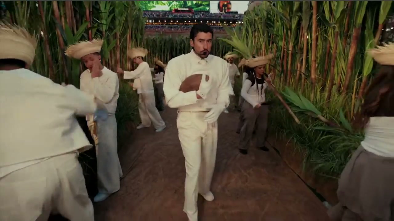 - Bad Bunny inició el concierto cantando “Titi me preguntó”, llevando un balón de fútbol americano, mientras caminaba entre cañizales rodeado de personas trabajando con machetes. También se desplazó entre vendedores de cocos fríos y piraguas (raspados), señores jugando dominó, muchachas haciendo uñas y trabajando en obras de construcción.