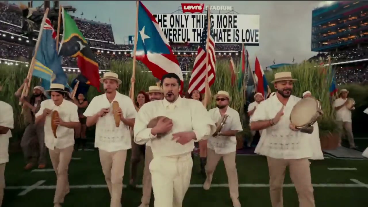 - Músicos hacían resonar tambores alrededor de Bad Bunny, y la pantalla gigante en el fondo mostraba la frase en inglés: “The only thing more powerful than hate is love” (la única cosa más poderosa que le odio es el amor).