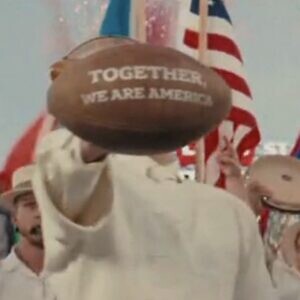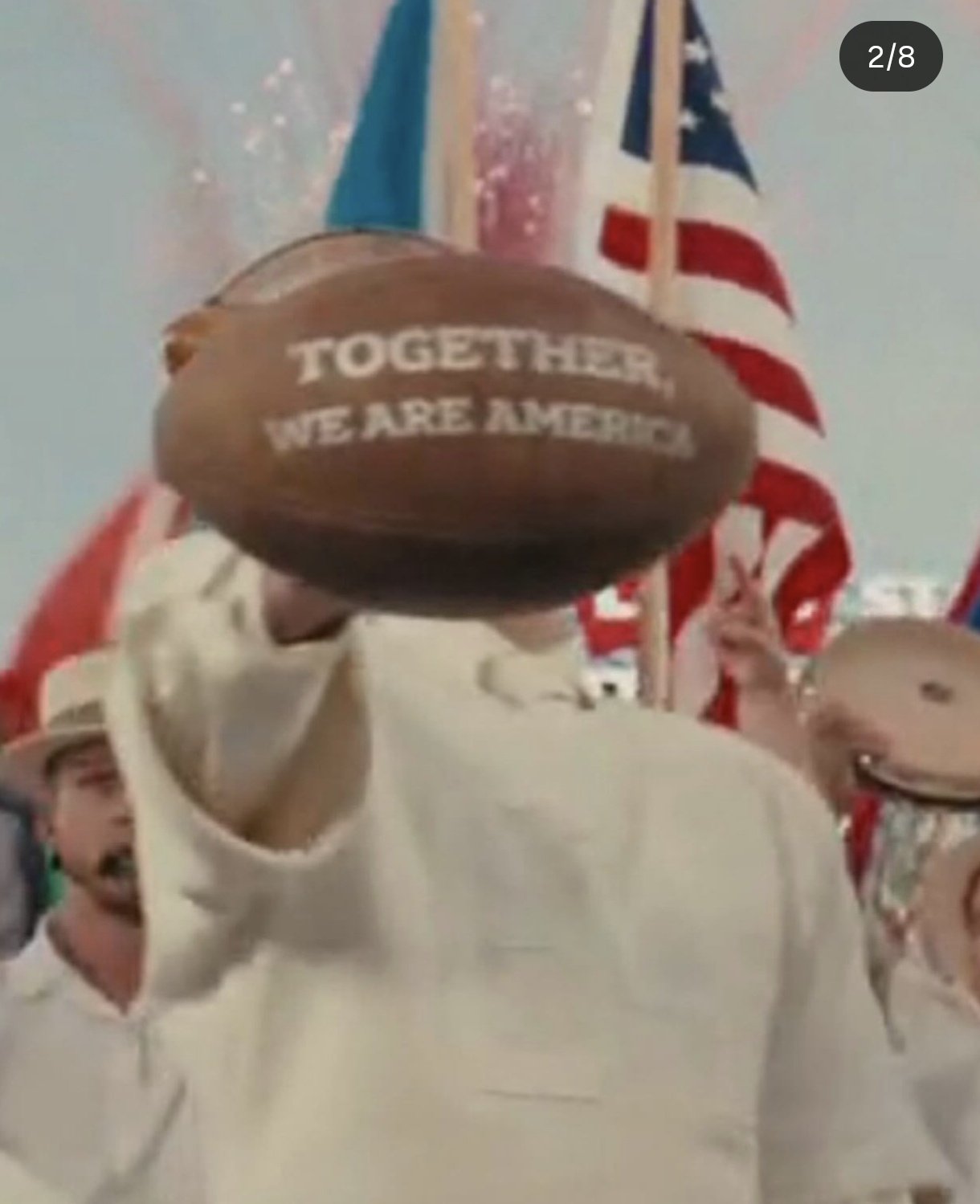 - Benito mostró muy rápidamente el balón a la cámara. Decía la frase: “Together we are America” (Juntos somos América). “¡Seguimos aquí!”, dijo en tono desafiante. Lanzó el balón al piso, como anotando un touchdown, para terminar.