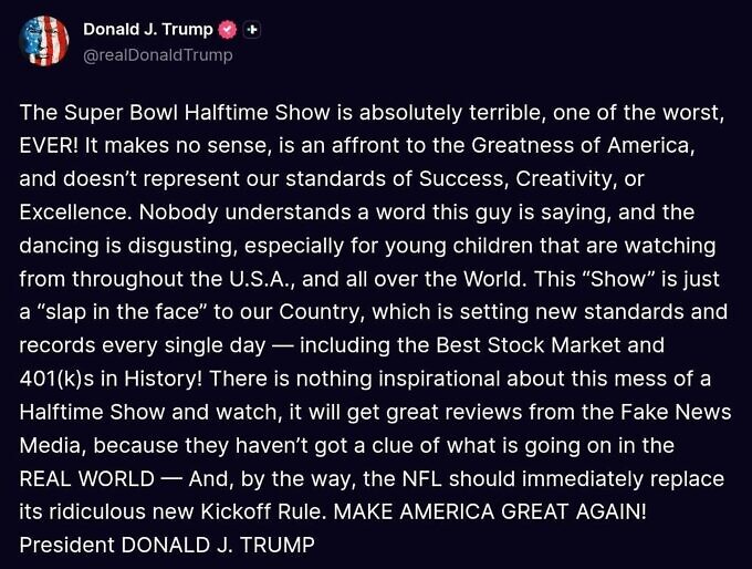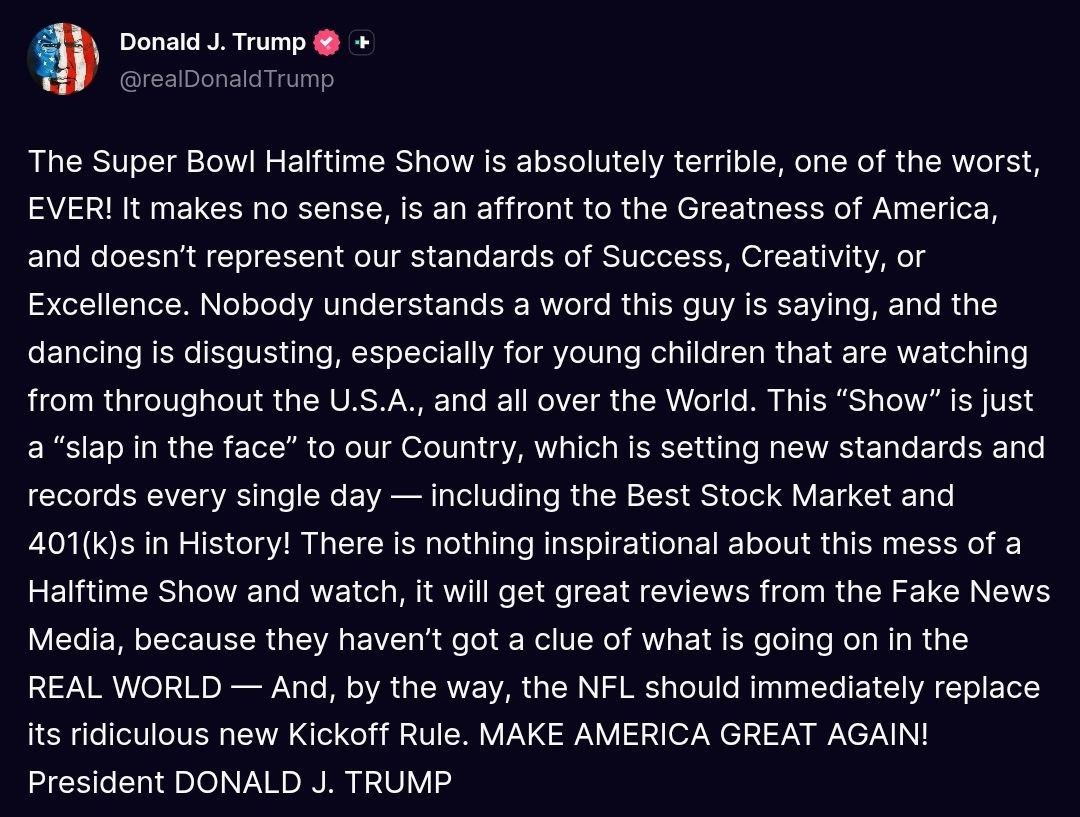 - Uno de los primeros en levantar su voz en contra del espectáculo fue Donald Trump en un post en su red social Truth, que hizo apenas minutos después de terminado el espectáculo, afirmando que “nadie entiende ni una palabra de lo que están diciendo” y que “el espectáculo es molesto, en especial para los niños que lo están viendo”.
