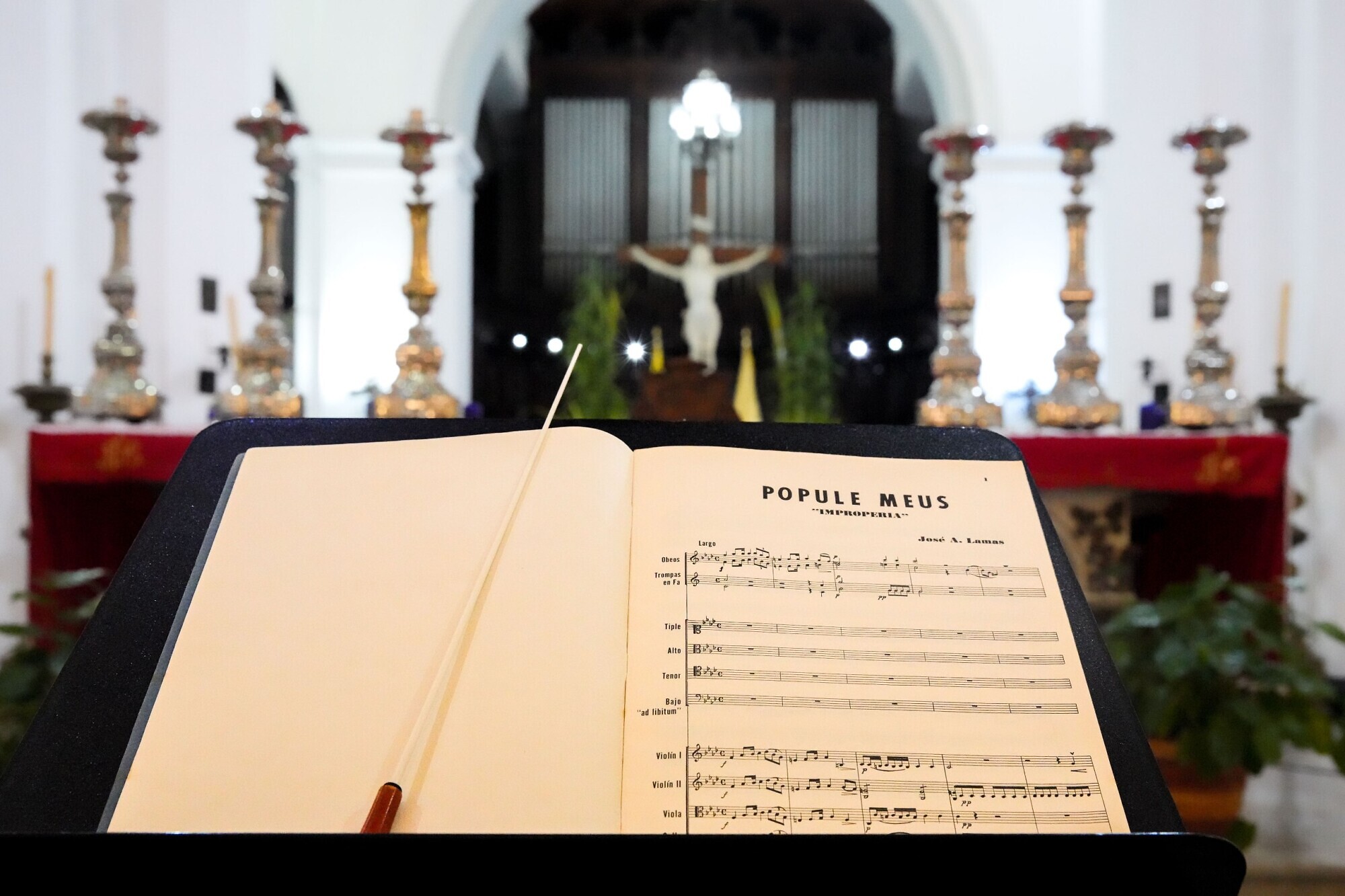 La gala sacra inició con la famosa partitura Popule Meus del maestro José Ángel Lamas, que fue escrita en 1801 y que pertenece al estilo barroco tardío, reflejando el espíritu piadoso y reflexivo que se expresa en la liturgia del Viernes Santo durante la Semana Mayor. Esta obra muestra los regaños de Jesús a su pueblo, en latín, que expresa: Popule Meus, quid feci tibi? Pueblo mío, ¿qué te he hecho?
