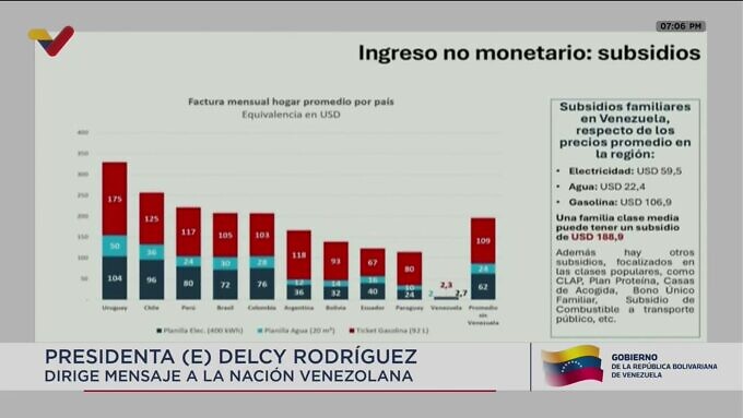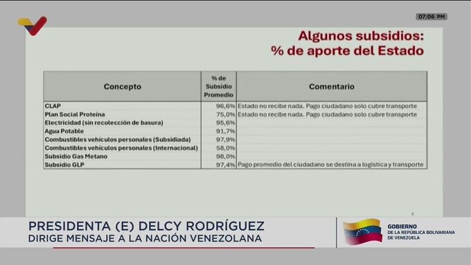 La presidenta encargada explicó que se han dado subsidios a la población a través de las bolsas de alimentación CLAP, el servicio de electricidad, agua potable y gas, como vías para “hacer justicia social” y acompañar a la población más vulnerable. Reconoce la voluntad del pueblo venezolano en todos estos años de dificultades.