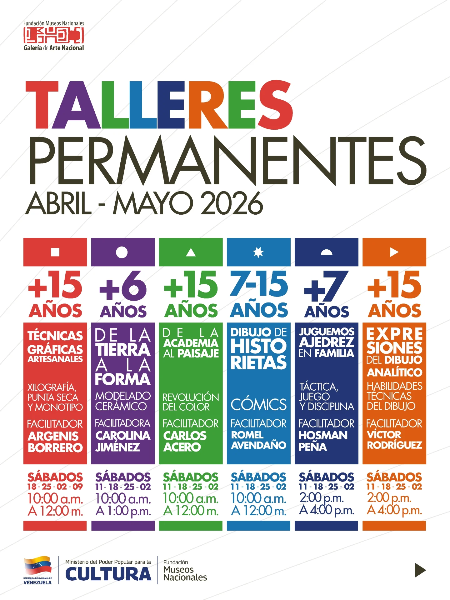 La Galería de Arte Nacional (GAN) abre sus inscripciones para los Talleres Permanentes de los meses de abril y mayo de 2026, un espacio diseñado para todas las edades donde el arte, la técnica y la tradición toman vida en las manos.