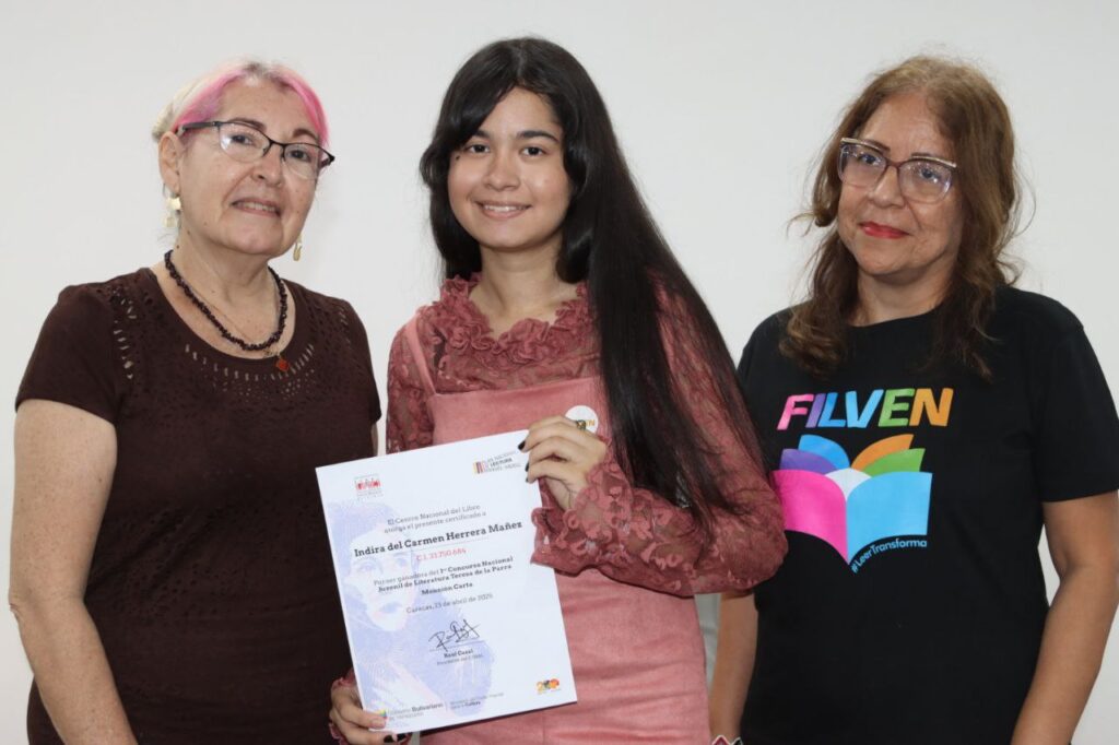 En el marco de la 20.ª Filven Carabobo, el Centro Nacional del Libro (Cenal) hizo entrega del correspondiente certificado a la estudiante carabobeña, Indira Herrera como una de las ganadoras del 1er Concurso Nacional Juvenil de Literatura Teresa de la Parra, cuyos resultados fueron anunciados el pasado 23 de abril durante el Día Internacional del Libro.