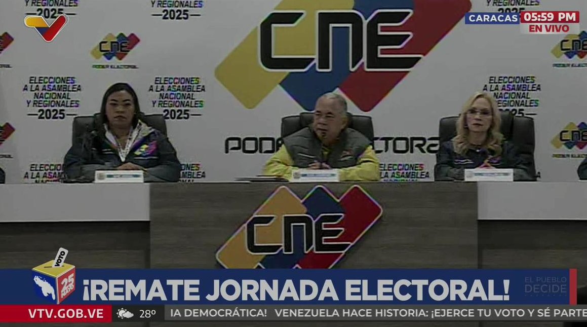 Elvis Amoroso, presidente del Consejo Nacional Electoral, informa este domingo a las 6 de la tarde que el proceso electoral se prorrogará una hora más. Si, tras finalizar esa hora, hay votantes en cola en centros de votación, deberán permanecer abiertos hasta que todos voten.
